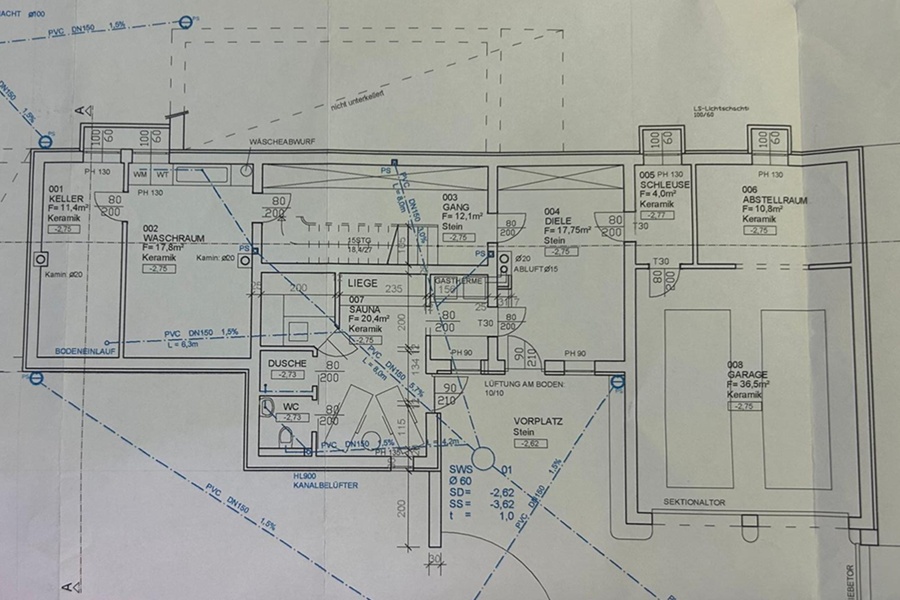 Das Wohnhaus befindet sich in einem technisch sehr gepflegten und zeitgemäßen Zustand. Der Zugang erfolgt über ein elektrisches Einfahrtstor sowie einen gepflasterten Innenhof. Im untersten Geschoss (teilweise ebenerdig) befinden sich eine weitere Garage, ein Vorraum sowie die komplette Haustechnik für Heizung, Sauna und Schwimmbad, zusätzlich Dusche und WC.