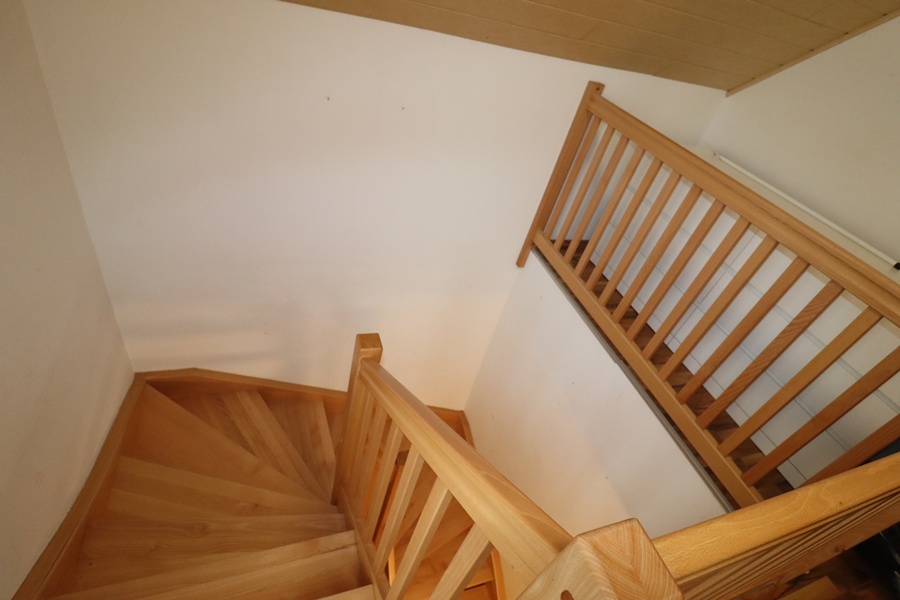 Eine massive Holzstiege verbindet die beiden Wohnebenen.